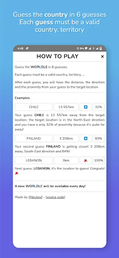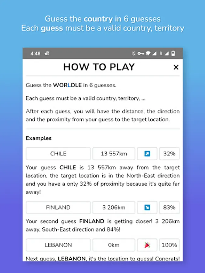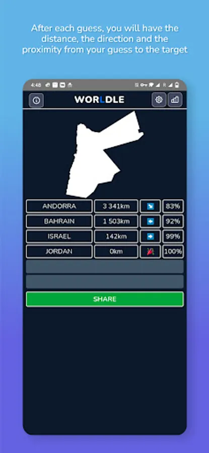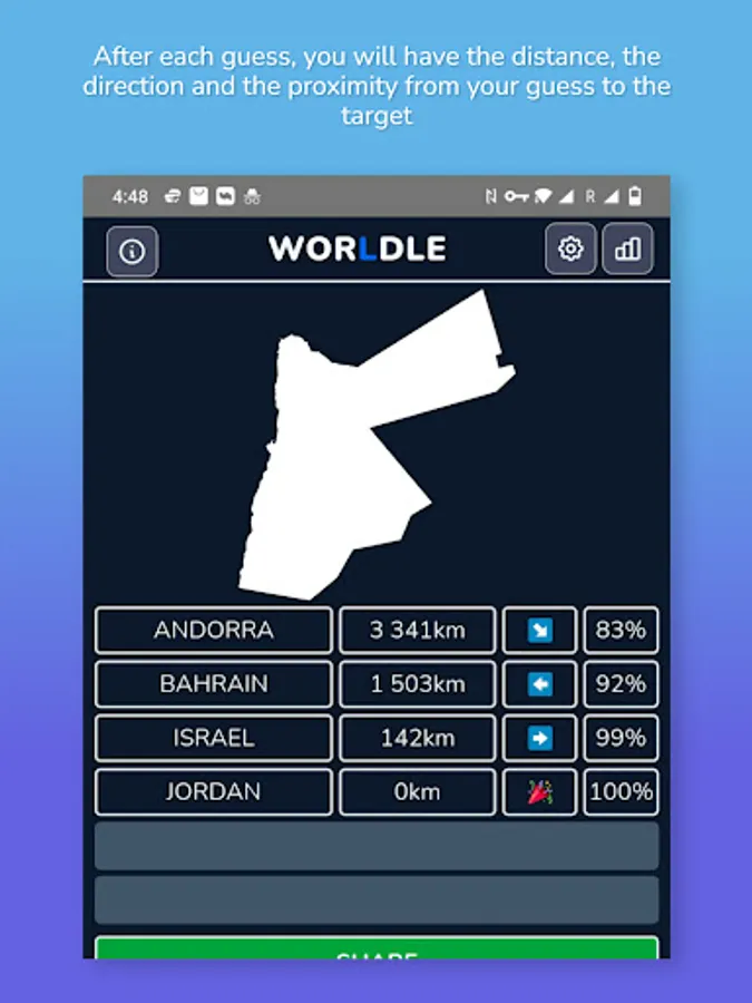 Worldle is a new word puzzle game focused on your knowledge of geography. In Worldle, you have six chances to find a mysterious geographic location. It can be a country, an island, or a territory. You will receive clues about the proximity of each of your guesses. Hints will show you the direction and distance at which you should search for the target area.