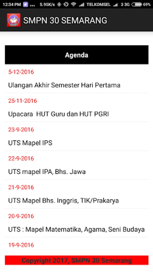 Fitur agenda ini terintegrasi dengan web SMP 30 Semarang yang berfungsi untuk memberikan agenda/jadwal kegiatan yang akan dilakukan oleh jajaran siswa atau guru smp 30 yang sudah terintegrasi secara real time .