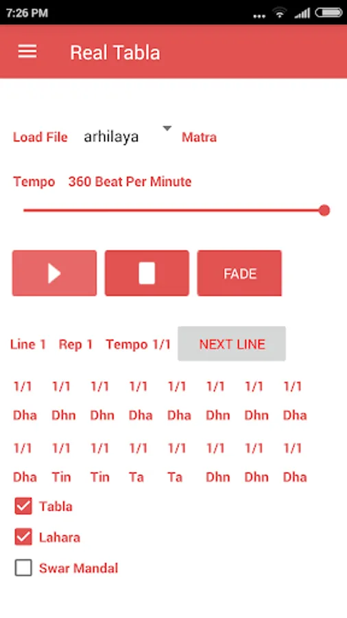 Select "User Taal" from menu to make your own taal .Tap at "Compose". Here the number of lines is equal to number o beats. Each line has one beat. If the line has 3 cells then each cell represents 1/3 beat. The number of cells can be 1 to 4. After composing tap at BACK button. Here you can play the composed taal at different tempo. There can never be an error in the number of beats of the taal.