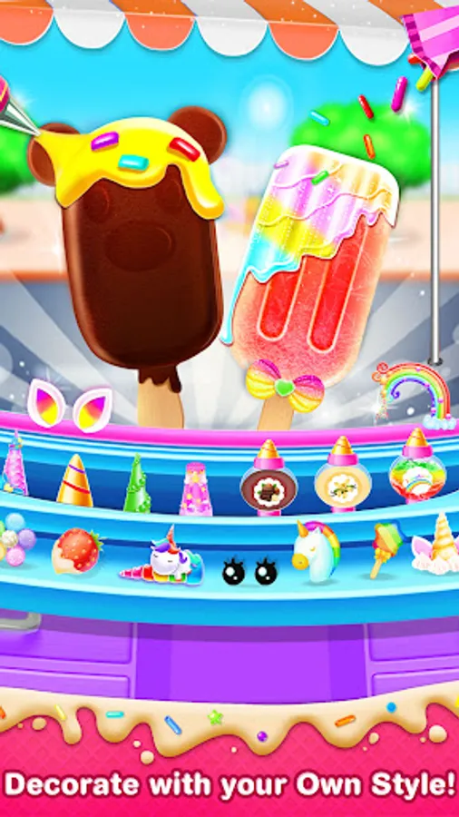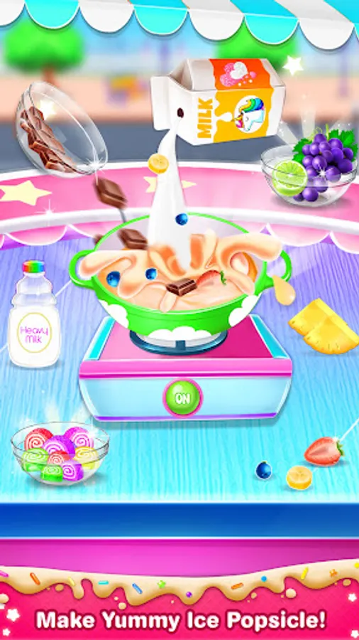 Let’s welcome our ice popsicles mania to the ice candy bar and get started with tons of unicorn game desserts making fun. Select your favorite ice cream in the world best ice cream game, set up your own frozen stacks, blend the ingredients, put yummiest perfect creams on top of your ice pops and make the best ever popsicles made in your unicorn game bakery.