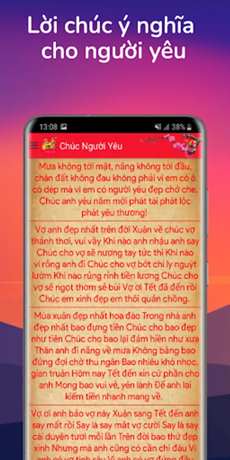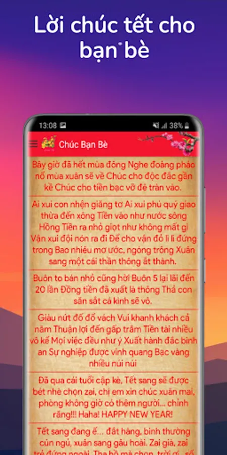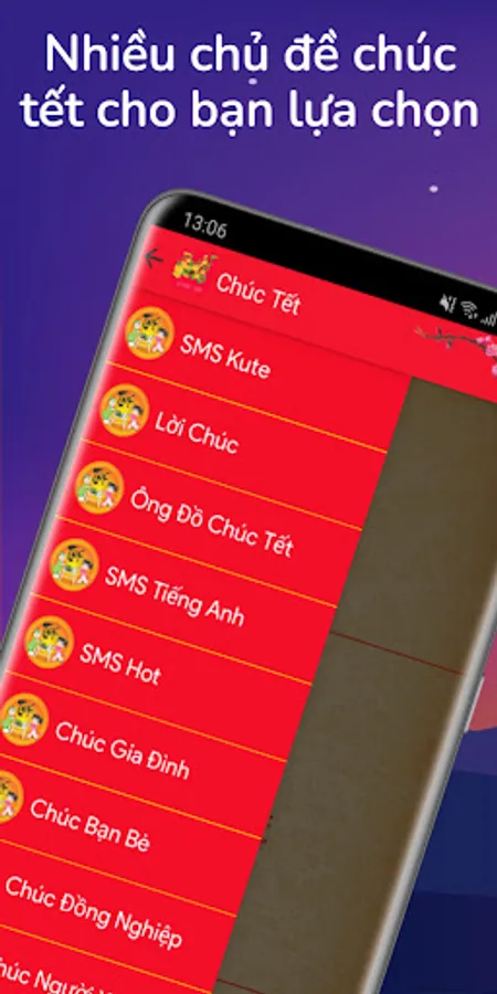 Ứng dụng Chúc Tết 2023 là tổng hợp những tin nhắn hình hay chữ dễ thương, độc đáo với nhiều chủ đề và thể loại cho bạn lựa chọn và có thể chuyển tới trình nhắn tin hay chia sẽ lên mạng xã hội. Hãy cùng Chúc Tết 2023 gửi lời chúc tốt đẹp nhất cho người thân và bạn bè trong dịp năm mới tết Quý Mão 2023 các bạn nhé.