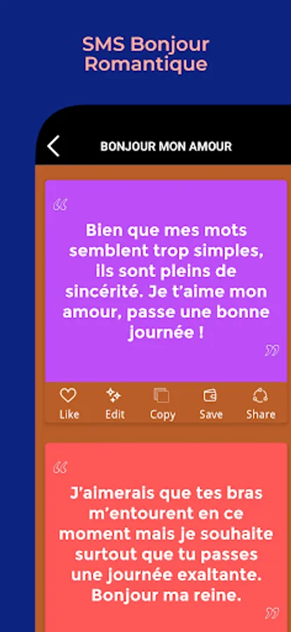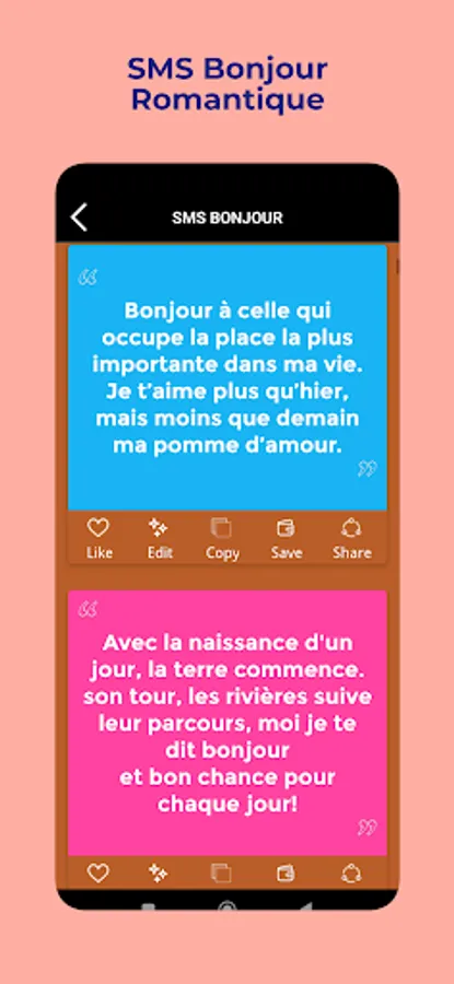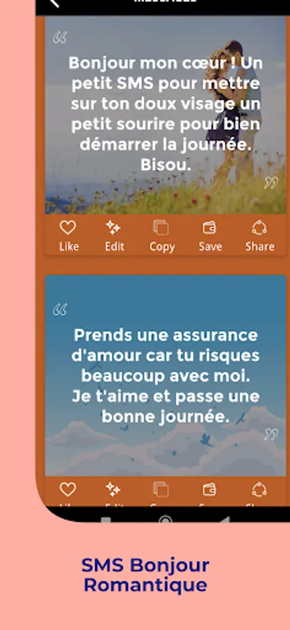 SMS Bonjour offers you SMS and messages in French to wish your loved ones a good day. Choose from the best selection of phrases and messages of love and friendship or positive thoughts and reflections and surprise your boyfriend or girlfriend, your beloved or your boyfriend or girlfriend. Tell them how much you appreciate them with these selected phrases!