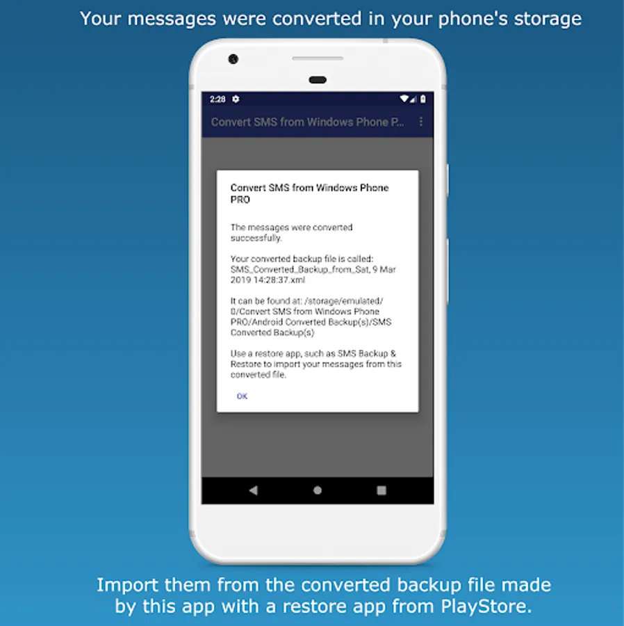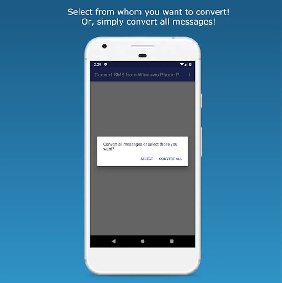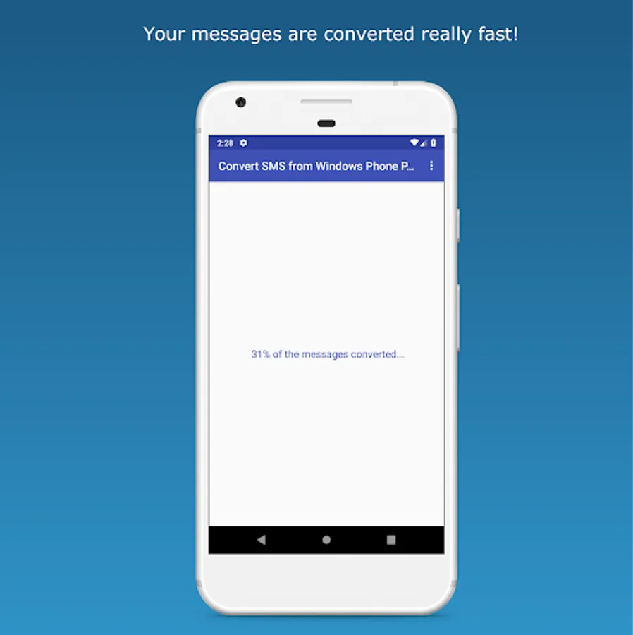 Convert SMS from Windows Phone PRO is the old version of the Import SMS from Windows Phone PRO application. Due to Google's new restrictions on SMS permissions, this app didn't got approval to import messages anymore. Except import, ALL the features are still available!