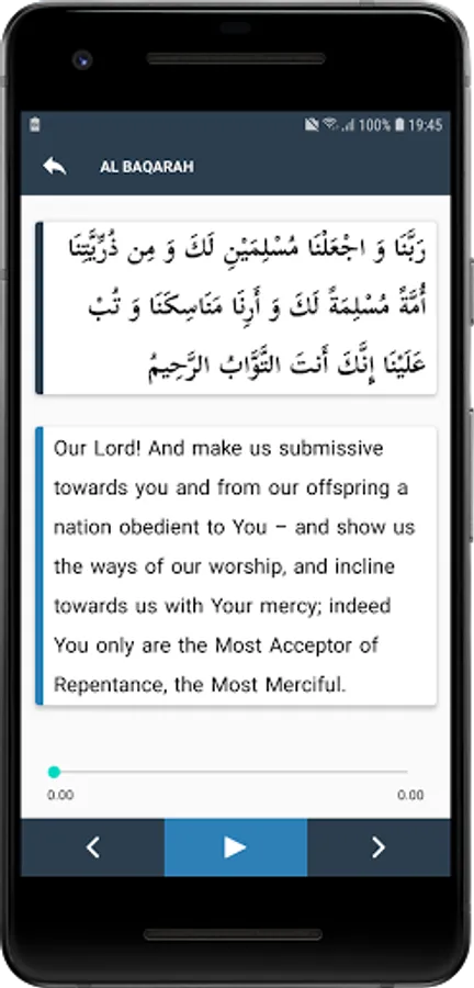 ---Play and Pause choices are offered to start and stop recitation anytime.