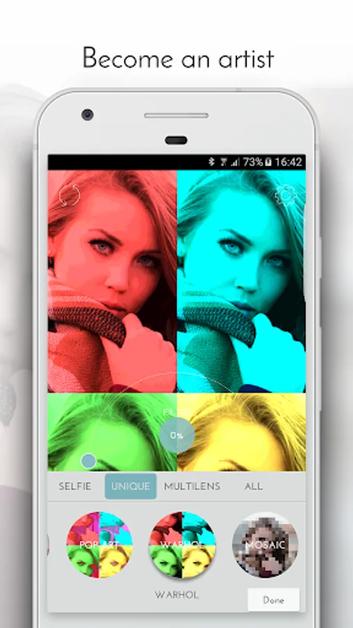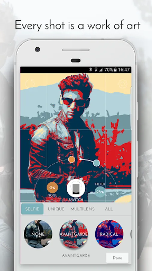 Use filters inspired by nature and artists. We have created filters which have never been seen before. Swipe left or right to change filters. Filter preview is shown in real-time in HD so you can see result from each filter instantly. You can also adjust filter and noise levels manually.