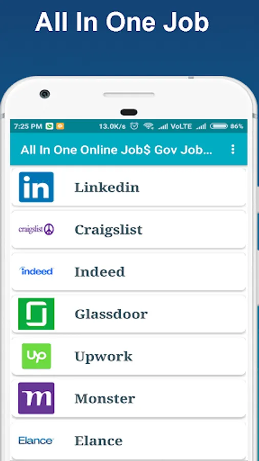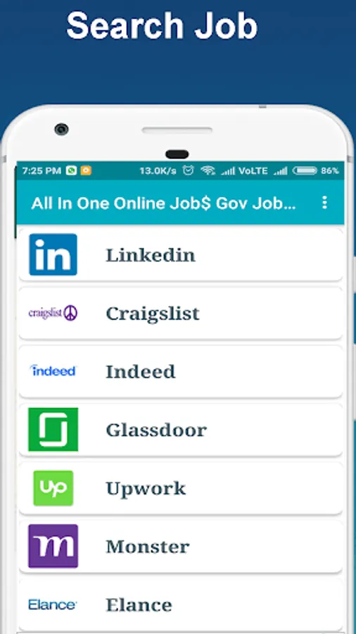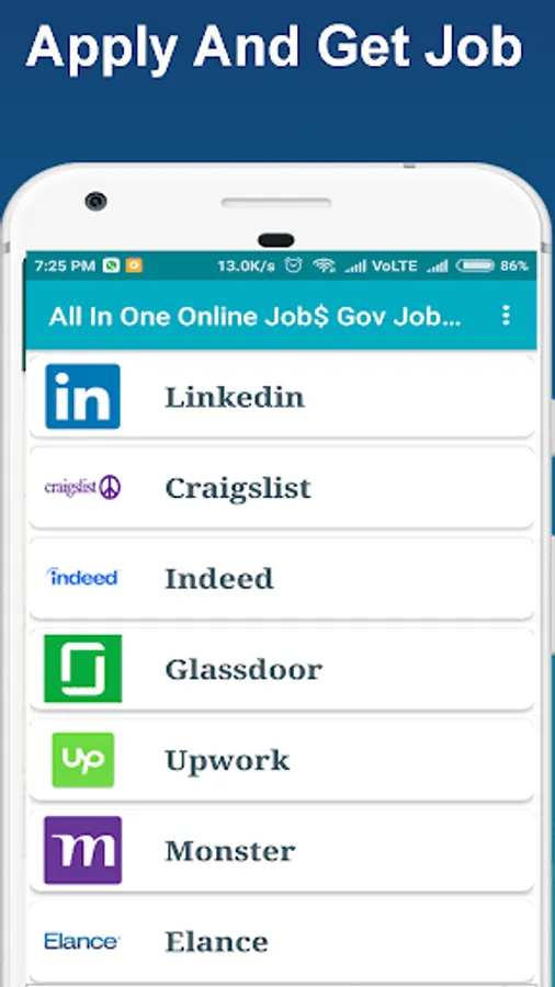 Linkedin,Craigslist,Indeed,Glassdoor,Upwork,Monster,Elance,Jobrapido,Splashfind,Freelancer,Careider,IEEEJobsite,AngelList,SimplyHired,Usajobs,Jobsdb,ZipRecruiter,GovernmentJobs,Snagajob,Dice,VeteransEmployment,Salary,Jobs,Psyccareers,Theladders,LiveCareer,SmartRecuiters,NewScientistJobs,TheChronicle,HigherEdJobs,RobertHalf,FlexJobs,Internships,SmartBrief,Jobs2Careers,Edjoin,Gigajob,MyPerfectresume,STJob,EFinancialCareers,Hcareers,Mediabistro,AmericanJobExchange,Careerage,ResumeNow,Randstad,Jobing,Experteer,TweetMyJobs,EveryJobForme,JobHunt,FindtheRightJob,JobHat,careeronestop,DiversityOne,VentureLoop,AssociationCareerNetworK,LocalJobster,JobTarget,LinkUp,ThePRSAJobcenter,AfterCollege,USjobs,StartUpHire,Hospitality Online,NAFSA,ResumeResource,