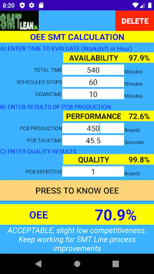 SMT OEE Calculator was designed to be used in all levels with responsibilities in a SMT Line Process: Quality, Production, Maintenance, Supervision, Planning, and Management.