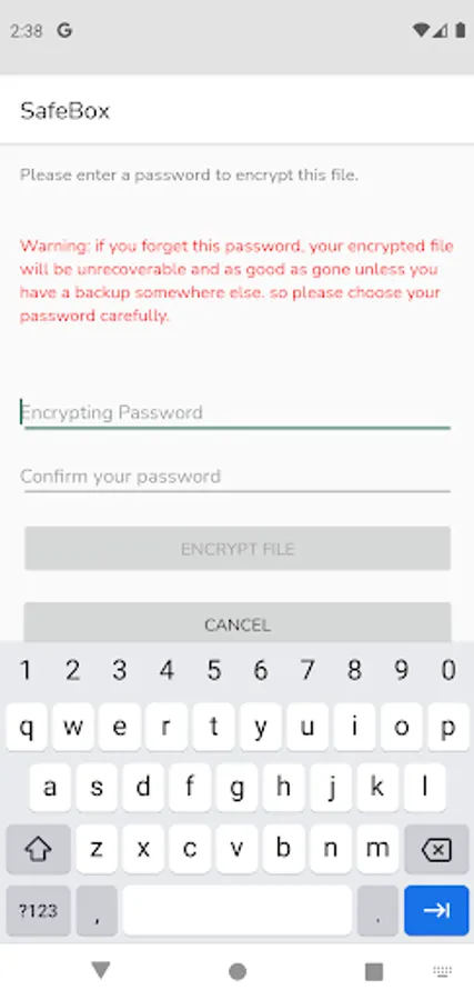 This app will never save your password so if you happen to forget the password of an encrypted file, you will not be able to recover it and the file will be as good as gone unless you have an unencrypted version backup elsewhere.