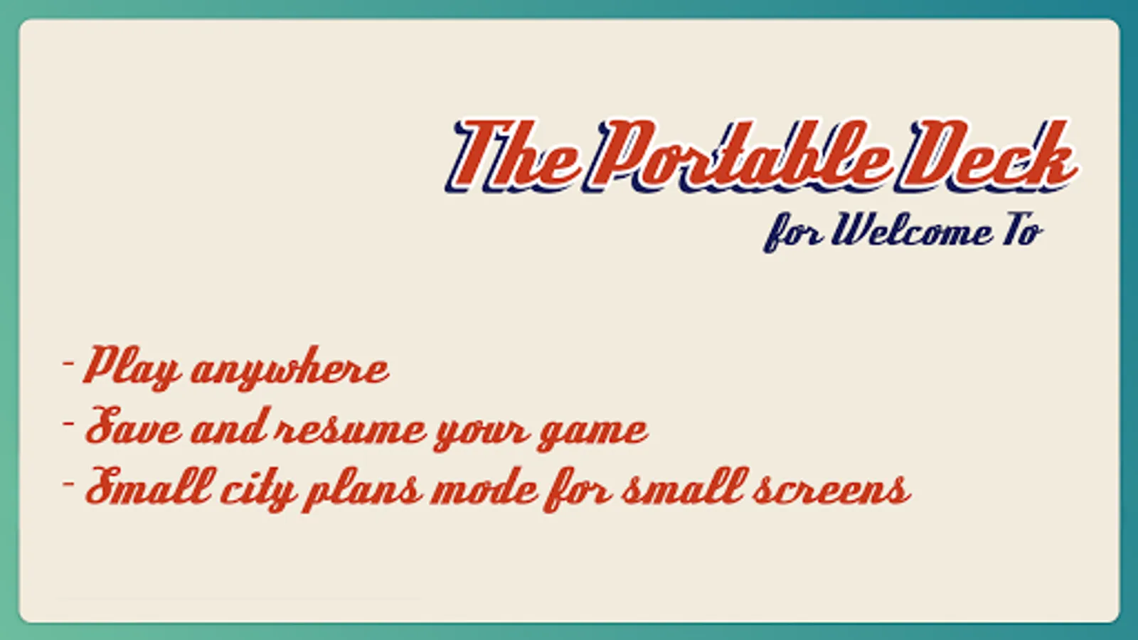 The Portable Deck allows you to take the classic roll and write gameplay of 'Welcome To...' on the go more easily. Don't worry about getting cards messy, bent or torn, losing them, or not having enough space to play. Just pack a couple of score sheets, and with this app you'll be ready to play anywhere!