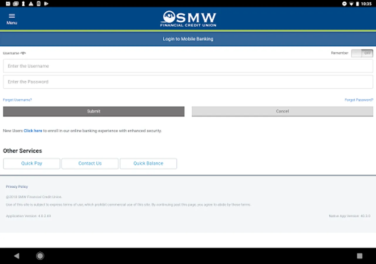 To use the SMW Mobile App, you must enroll in our Online Banking or Mobile Banking experience with enhanced security. To register for Internet banking, please visit www.smwfcu.com.