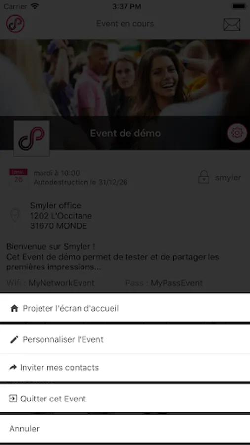 CUSTOMIZATION. Select your color, logo, address and description of your event and generate the access code.