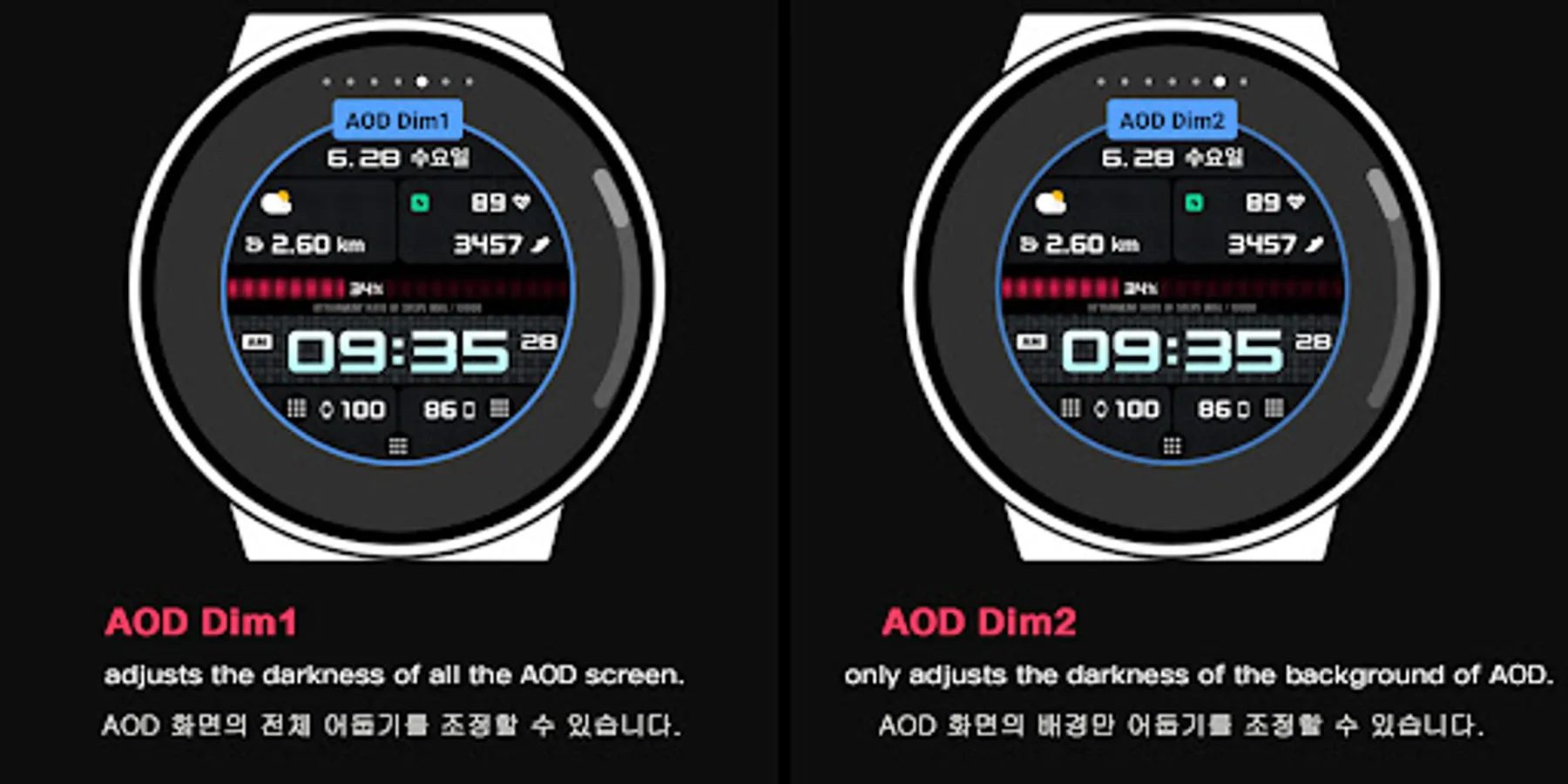 In the Customize section, 'AOD Dim1' adjusts the darkness of all the AOD screen. And 'AOD Dim2' only adjusts the darkness of the background of AOD screen.