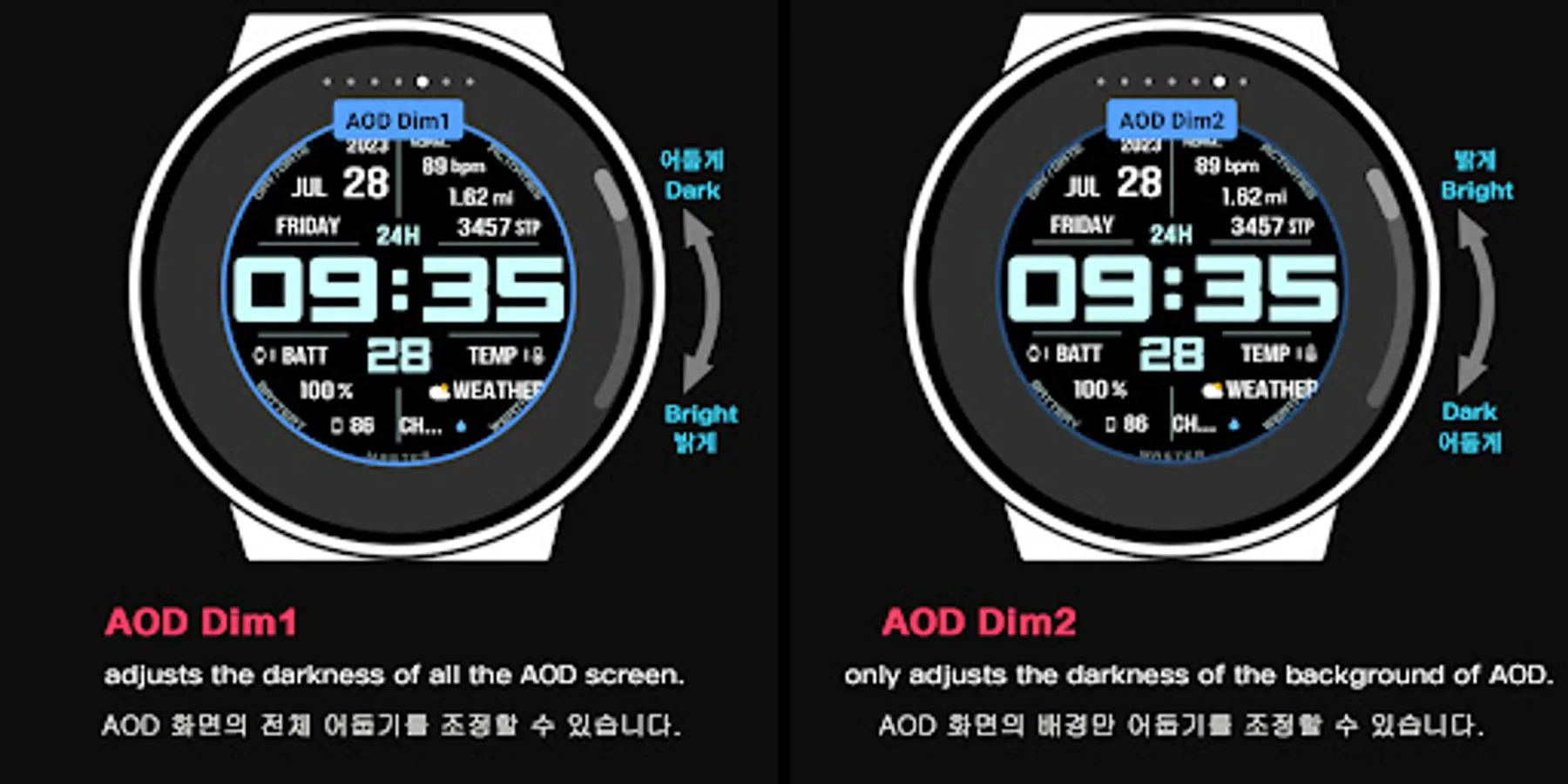 In the Customize section, 'AOD Dim1' adjusts the darkness of all the AOD screen. And 'AOD Dim2' only adjusts the darkness of the background of AOD screen.