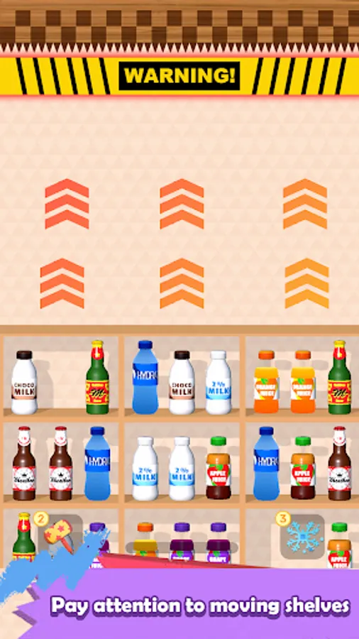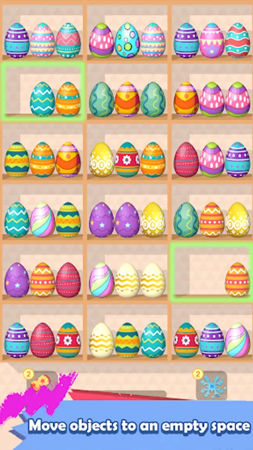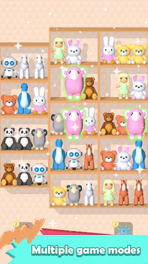 * Keep sorting and matching objects until all tiles are cleared and make the shelves tidy again.