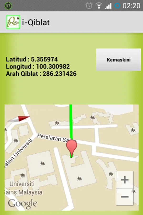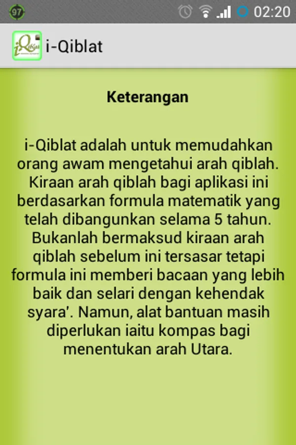 i-Qibla is an application to allow the public to know the direction of Qibla. Count towards qiblat for this application based on mathematical formulas that have been developed over 5 years. Not mean counts towards the qiblah previously missed but this formula gives a better reading and in line with the requirements of Islam. However, aid is still needed a compass to determine the direction of the North.