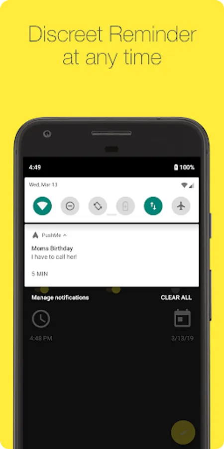 You can remind yourself with a notification instead of using a loud and disturbing alarm or calendar event. You can write down your grocery list or a quick message to not forget what to buy. Set up simple reminders for online auctions or tasks, appointments and upcoming events like a barbershop or doctors appointment. Get reminded to send a text for your friends birthday or message your coworker for a lunch date. Many successful people write down lists, notes or messages to stay organised and to never forget important tasks or events. Simple and effective reminder with PushMe.