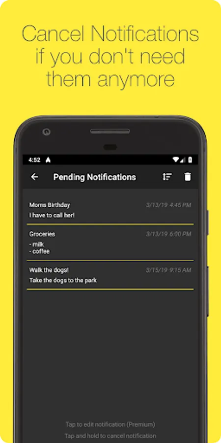 • Edit already set notifications (title, message, sound, vibration and persistent)
