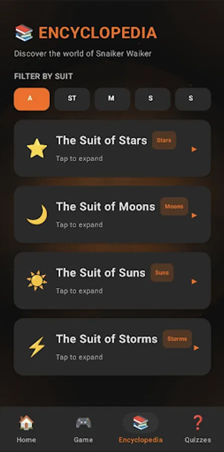 Beyond the core gameplay, Snai offers a rich Encyclopedia section that delves into the fictional lore of four mystical card suits: Stars, Moons, Suns, and Storms. Each article provides detailed background information about these mythical elements, creating a cohesive narrative universe that enhances the gaming experience. The Encyclopedia serves as both entertainment and educational content, allowing players to immerse themselves in the world of Snai while learning about the game's unique mythology and backstory.
