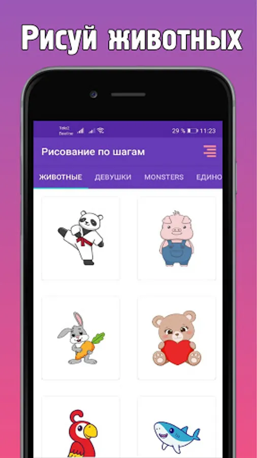 Simple shapes are gradually transformed into realistic animal images in a cartoon style. You just need to follow the step-by-step guide on the smartphone display and keep drawing. All drawings look as clear as possible