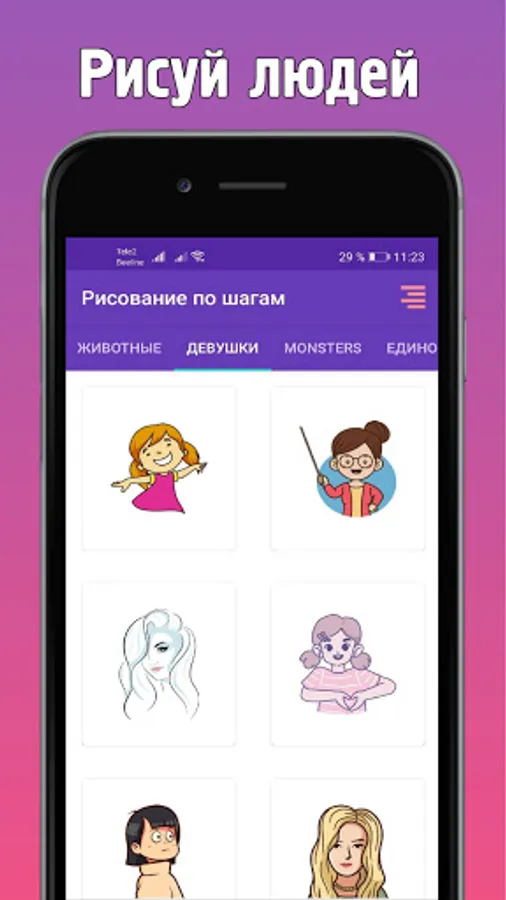 If you were thinking of learning how to draw people or realistic animals so that your friends would envy you, then this application is especially for you. The application contains a huge collection of step-by-step instructions, thanks to which you can draw like a pro