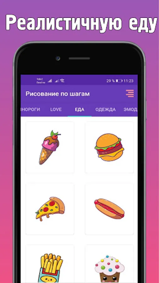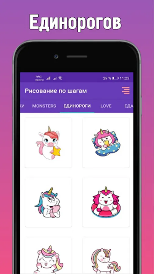 Everything is done so as to understand how to draw different pictures in stages, any person figured it out. Even those who do not have any drawing skills, the application will help to create a pretty picture. It is as simple as possible to work here. The screen describes in detail how to draw a favorite animal or any other object in stages. Each of them has its own section. Now you can try your hand at drawing flowers and plants, vehicles, food and even girls. Beautiful images will come out from under your pen easily and at ease