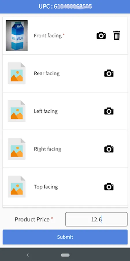 UPC Collector application helps to capture a product's meta information like UPC, photos of different facings and price. User can scan the barcode on product packaging to determine the product UPC and then capture photos of different facings of the product and retail price.