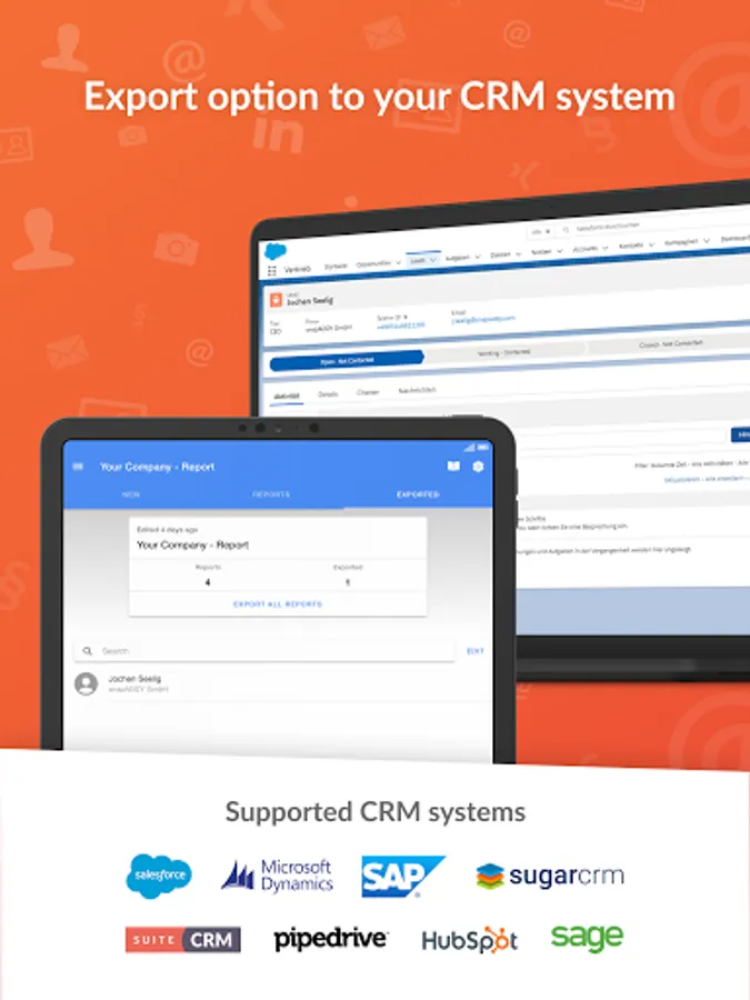 Thanks to the VisitReport app, you always have your individually designed questionnaire at hand and digitally on your tablet or smartphone. After the customer meeting you can export it quickly and easily to your CRM system. This way, neither time nor valuable information is lost. In addition, all customer information is stored centrally where it is best kept: In your CRM system. The complicated intermediate step of manual data transfer and preparation is completely eliminated. Your colleagues in the office can directly take over and process the customer operation. snapADDY VisitReport brings the digital capture of leads and visit reports to a new level.