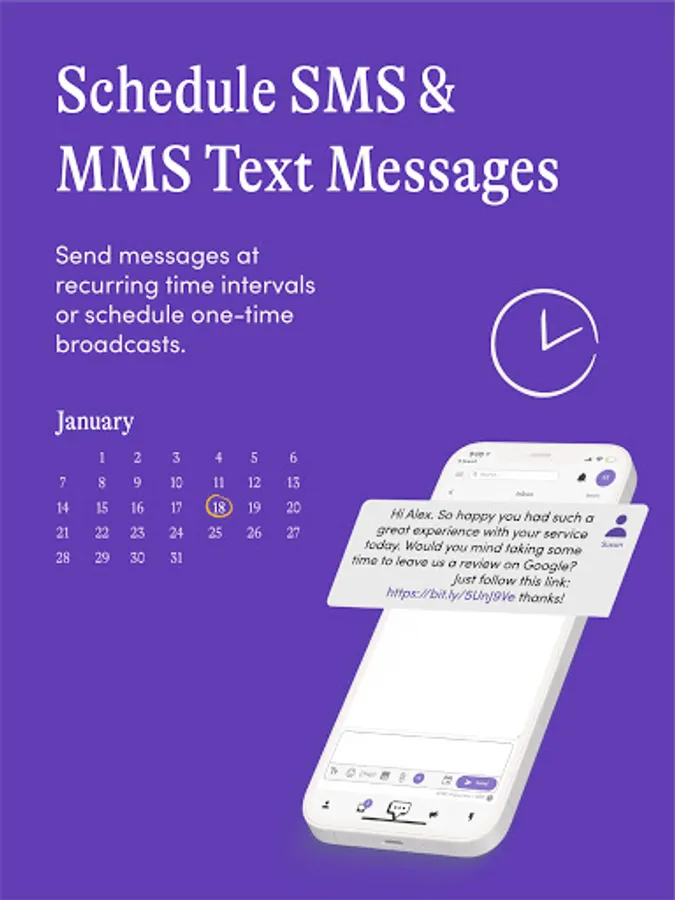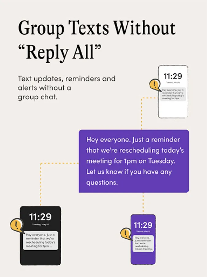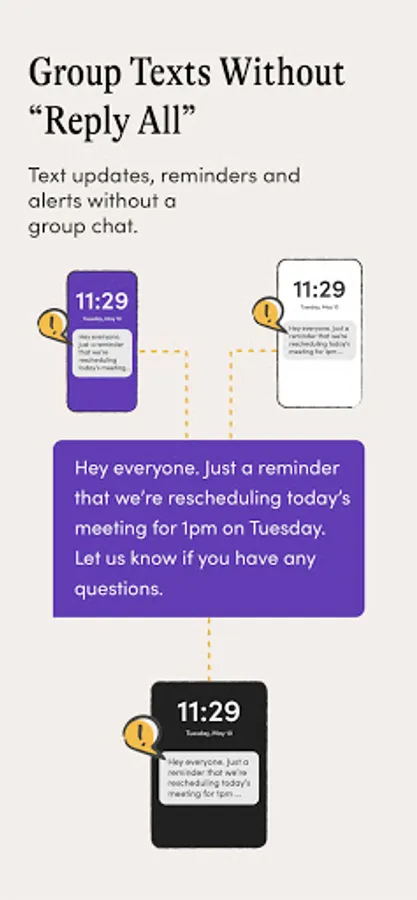 MessageDesk makes it easy to schedule private, 1-on-1, and group text messages. Text from one 10-digit, local, phone number from any device. Send group text messages to individual contacts, without "reply all". Each message sent from MessageDesk starts its own individual text thread.