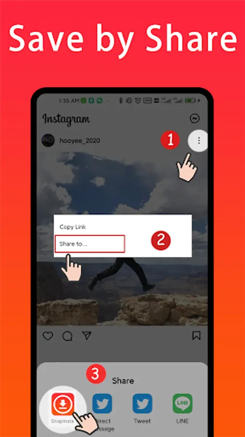 ⚡Step 1: Choose the story highlight, IGTV video, photoes, reels or videos that you like, click the share to, and select the "Video Downloader for Instagram" app. It will auto download it.
