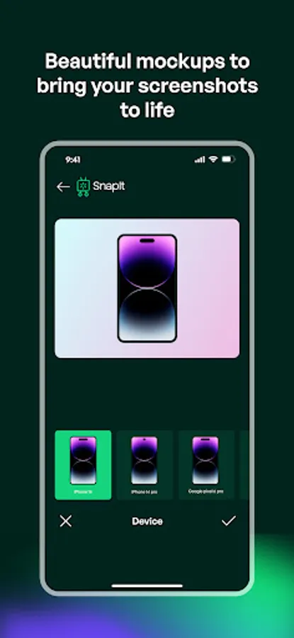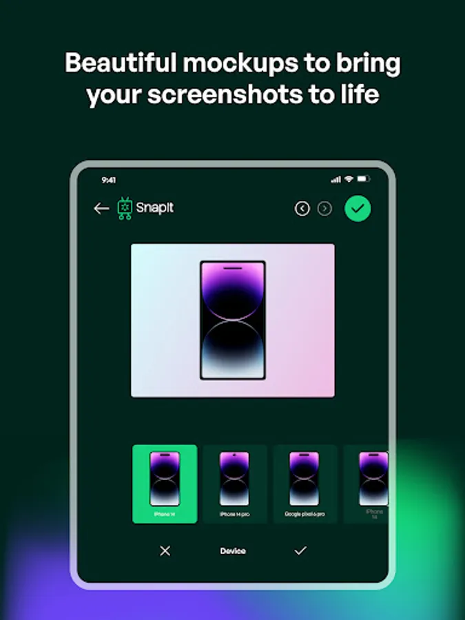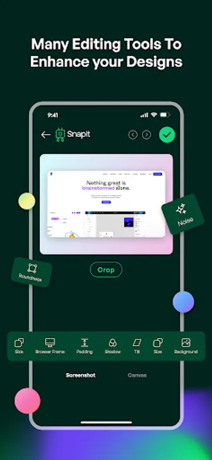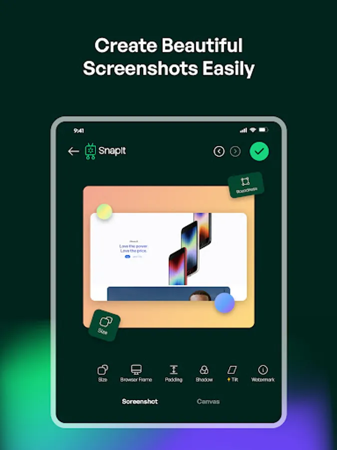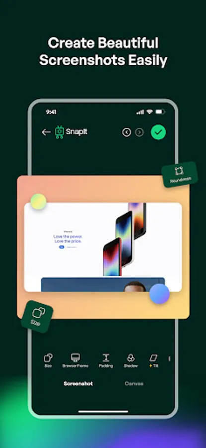 You can add browserframes, apply beautiful backgrounds, select device templates, capture screenshots directly from a URL, add custom texts and watermarks, make code snippets and mockups. All the features you need to enhance your online content.