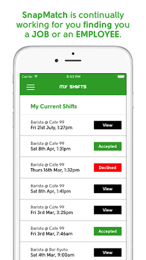 SnapMatch is continually working for you finding you a job or an employee. SnapMatch will make managing a shift roster easy, confirming availability and acceptance in seconds.