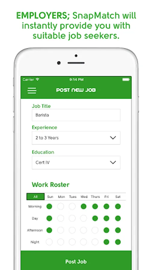 Job Seekers create a free personal SnapMatch profile letting SnapMatch and employers know when you require work. You will receive job offers that match your skills and availability.