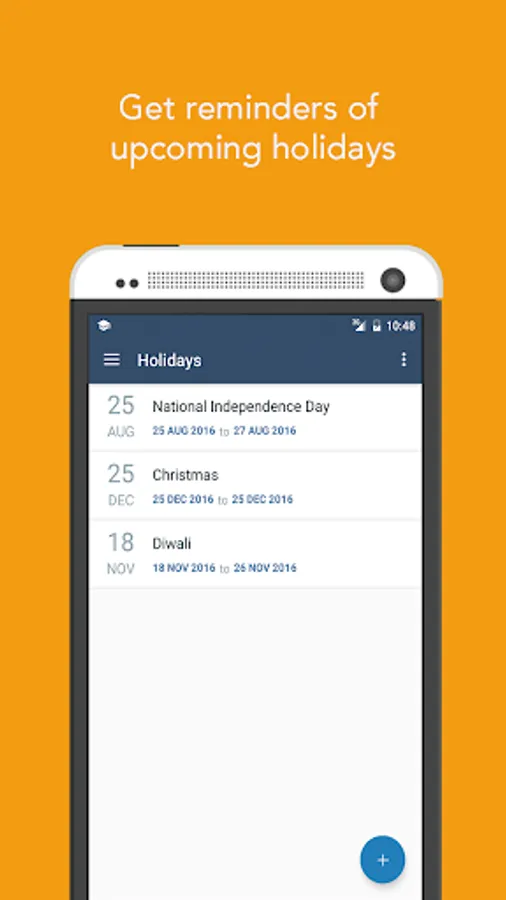 Enter holidays/days off - get notified of an upcoming holiday to enjoy your time off/