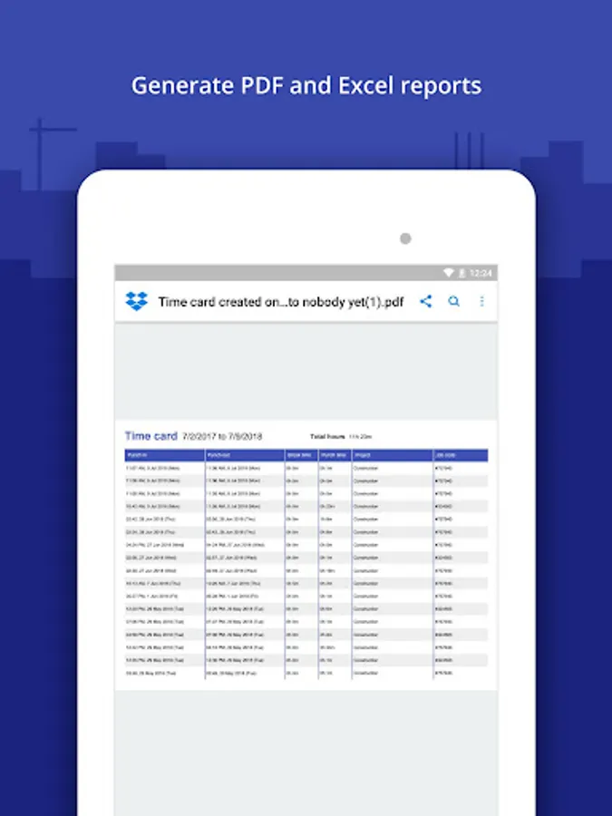 Punch In / Out Timesheet App is the easiest way to track working hours on multiple projects. Create projects, job codes and track daily shifts. Users punch in and out on their mobile devices, optionally add breaks and details, generate professional looking PDF and Excel time cards and send them to the management or accounting. Analyze time spent on projects with the Dashboard. PDF and Excel time card reports are stored on the device, can be shared via cloud drives, emailed or printed. Find your time cards quickly and easily anytime anywhere.