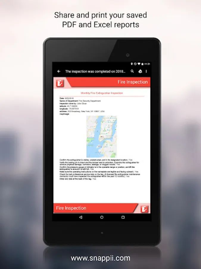 The Fire Inspection app covers such important fire safety components as extinguishers, fire hydrants, fire prevention, day care fire inspection and more. Utilizing mobile forms included in the app fire inspectors can collect, email and share valuable inspection data, store it locally on device, access and edit it.