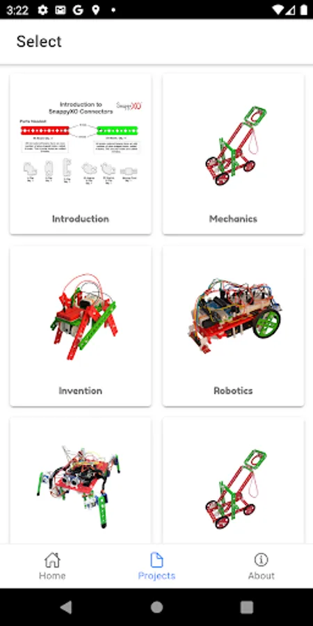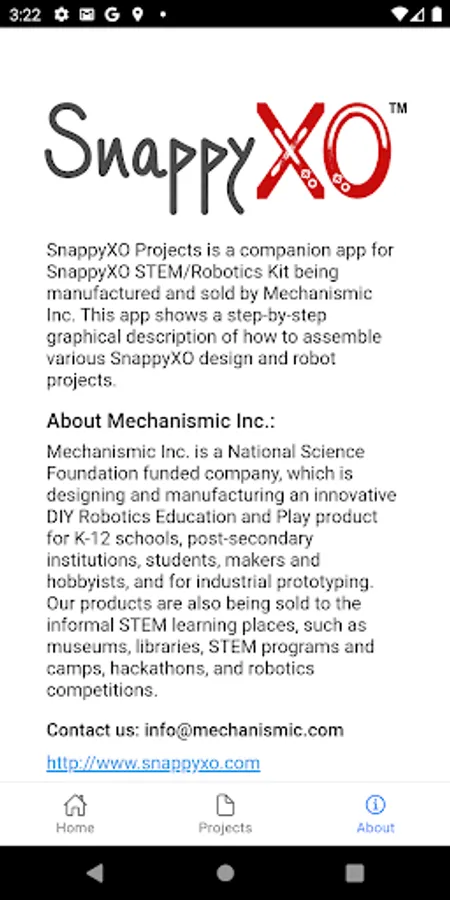 SnappyXO Projects is a companion app for SnappyXO STEM/Robotics Kit being manufactured and sold by Mechanismic Inc. This app shows a step-by-step graphical description of how to assemble various SnappyXO design and robot projects.
