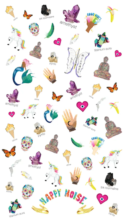 Enter the healing magical world of Happy Noise. Think of us as your digital shaman who allows you to send good vibes to your homies. A symbolic guide of mystical realism for the modern intuitive includes healing crystals, archangels, magic and codes. From sending Archangel Michael to protect a friend to cleansing your feed with sage, escape into our playful, fun and colorful world of spreading kindness, love and joy. Make your digital footprint HAPPY.