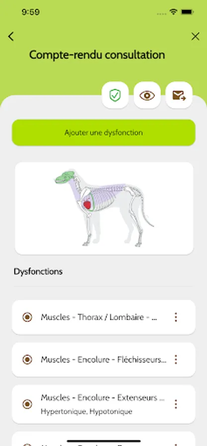 You list the osteopathic dysfunctions noted during the consultation and an interactive diagram clearly presents the joints, organs or muscles concerned. Thanks to the drop-down menus, editing is very fast. You also have a space to add any comments and your rehabilitation advice. You have the option of immediately sharing this report with the owner of the animal.