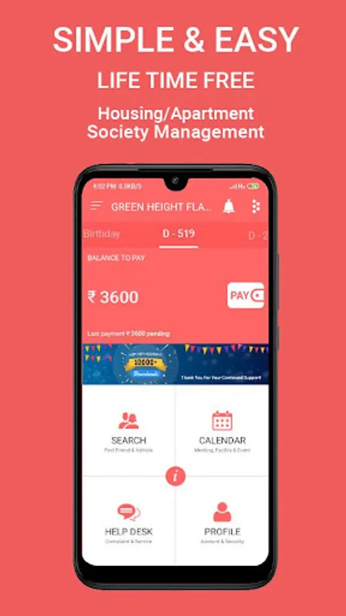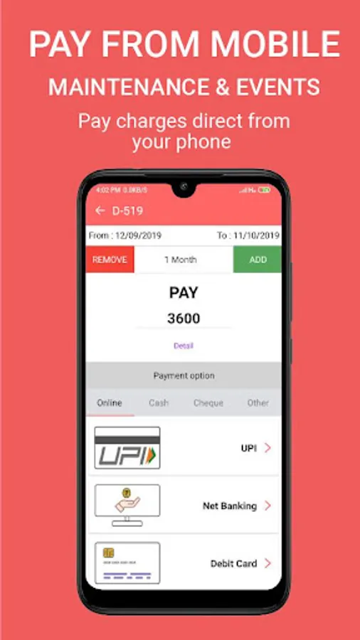 Payment Management: Get maintenance, events and amenities payment direct in community / society bank account through UPI, credit card, debit card or net banking online payment; and generate accounting and pending balance report in just one click.