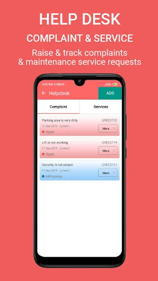 Helpdesk & Broadcast: Easily maintain and group different types of complaints and service requests. Notify the progress and provide action taken on complaint and service request with attach photos and comments.