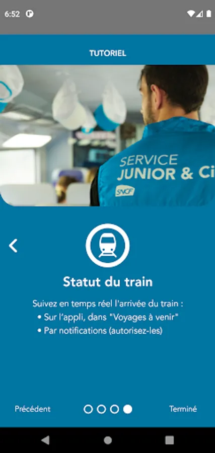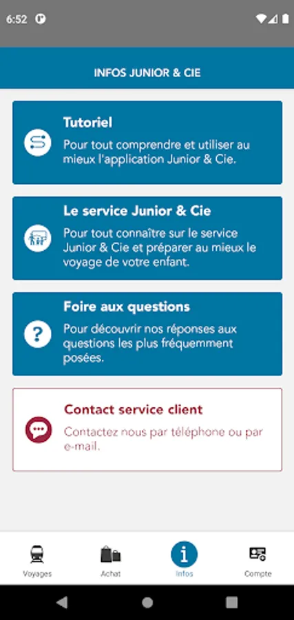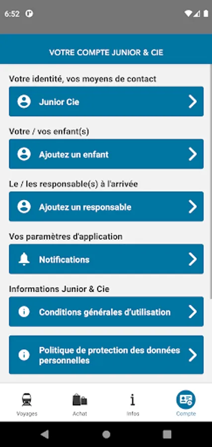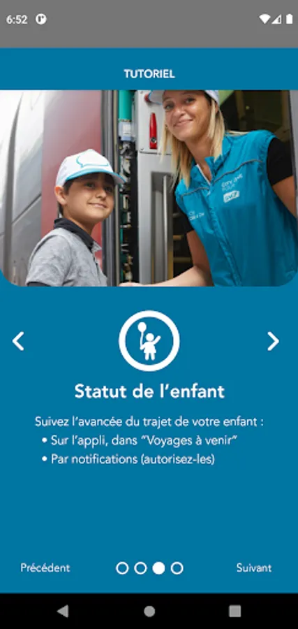 It allows you to book the service, find all the information about your child's trip, know the constitution of the group of children on board, directly present the e-ticket via smartphone, and be informed in real time ( eg: change of meeting point, monitoring of the child and the arrival time of the train), ...