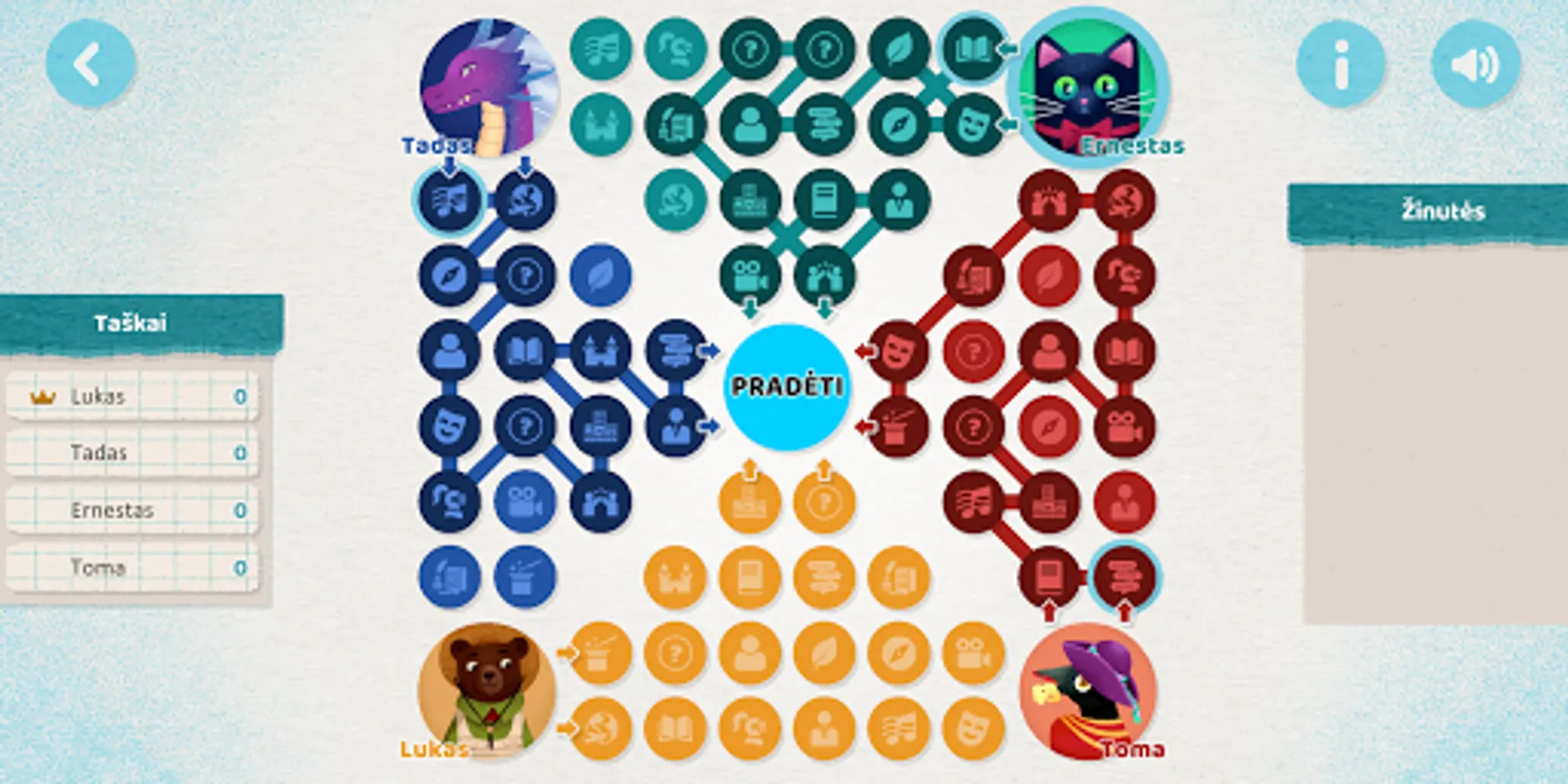 At the beginning of the game, you are presented with the opportunity to play online with up to three other friends or teams of friends from nearby or other cities. Choosing one of four characters created by the children themselves (Cat, Dragon, Varna and Bear) enters the game board. Use the box symbols that represent the topics of the questions to make your way to the Ponulus Literature. The path must consist of 13 cells.