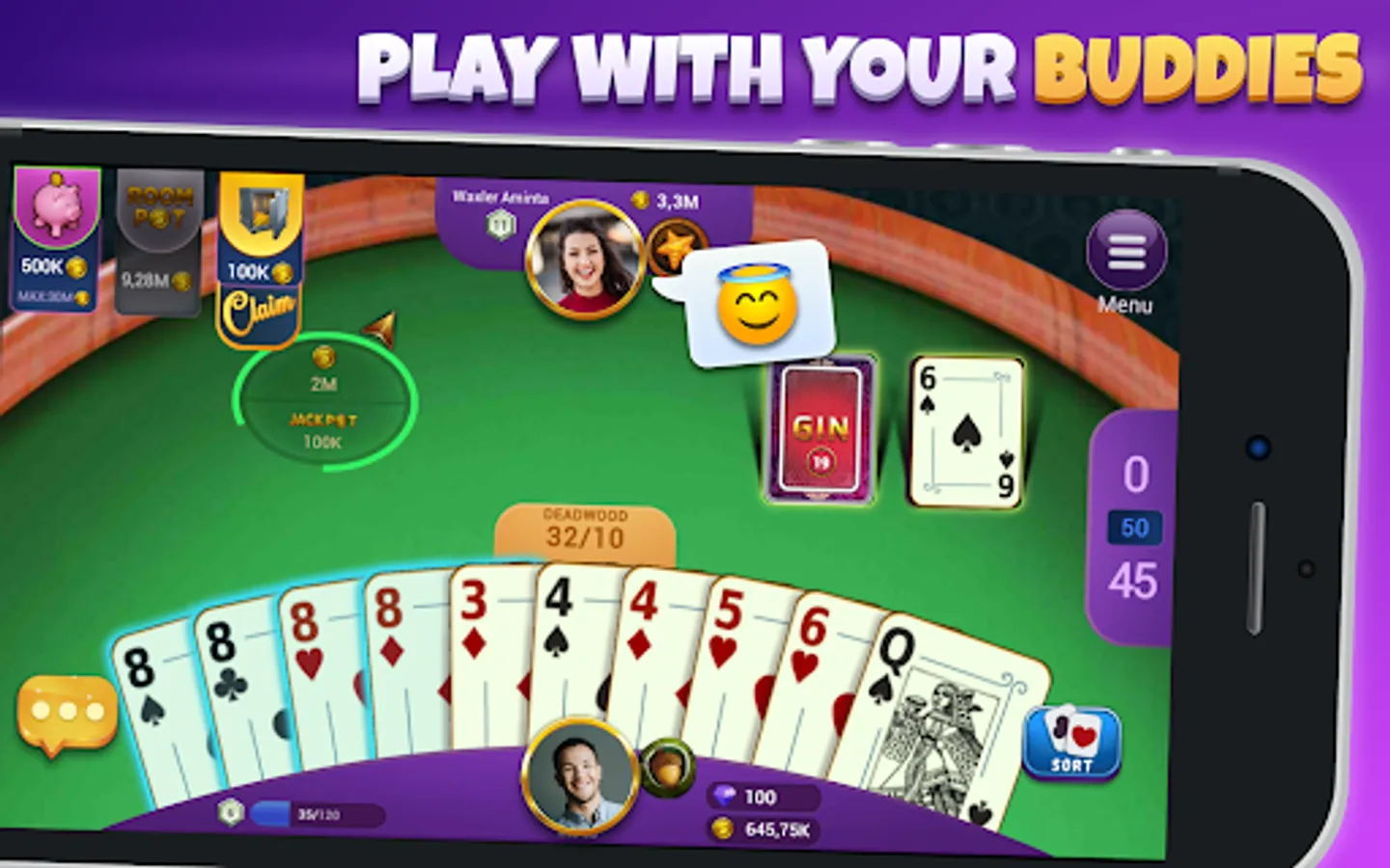 Gin Rummy with your buddies by SNG is a real time card game for two players, combining elements of the card games Rummy, Cribbage and Euchre. The main contribution of our game is playing gin rummy plus its betting and room structure. You never run out of chips. We always send you millions of chips as gift. By this way, you can always play in high-bet rooms. Play the best free online game Gin Rummy with your buddies and improve your skills.