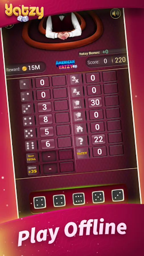 YATZY is a board game with its original rules. Five dices with six sides and 15 sections to be filled in 15 rounds. It is a Scandinavian public domain dice game very similar to Poker Dice, Yacht, Generala and Cheerio. Yatzy is also known as Yachty and Farkle in different countries. You can play Yazy with your virtual buddies with high level artificial intelligence. Do not hesitate to play Yatzee with your make-believe friends. They are virtual but this prevents wasting precious time for waiting for live opponents.