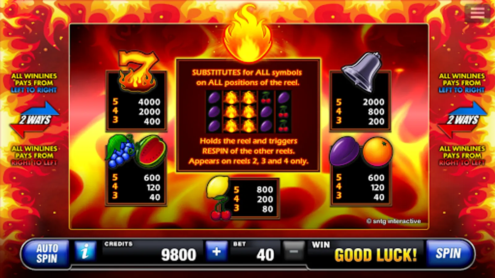 This fruit game on 10 lines and 5 reels will thrill you with expanding flames, hot fruits and a win line system that works two ways: Left to right and right to left – however you see it, it pays.
