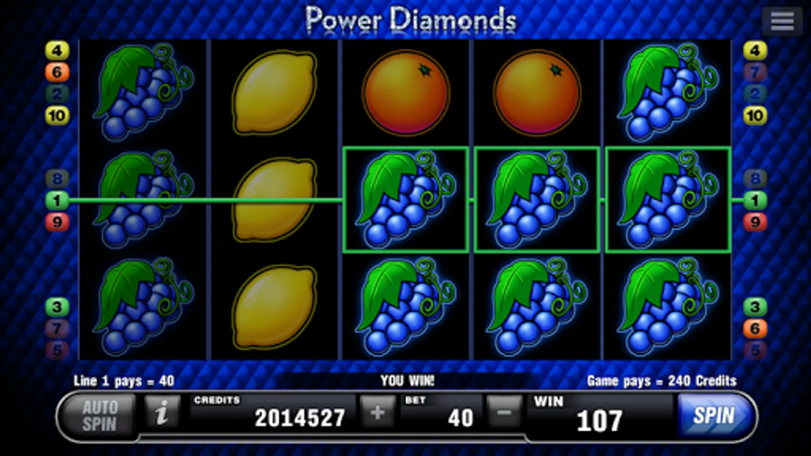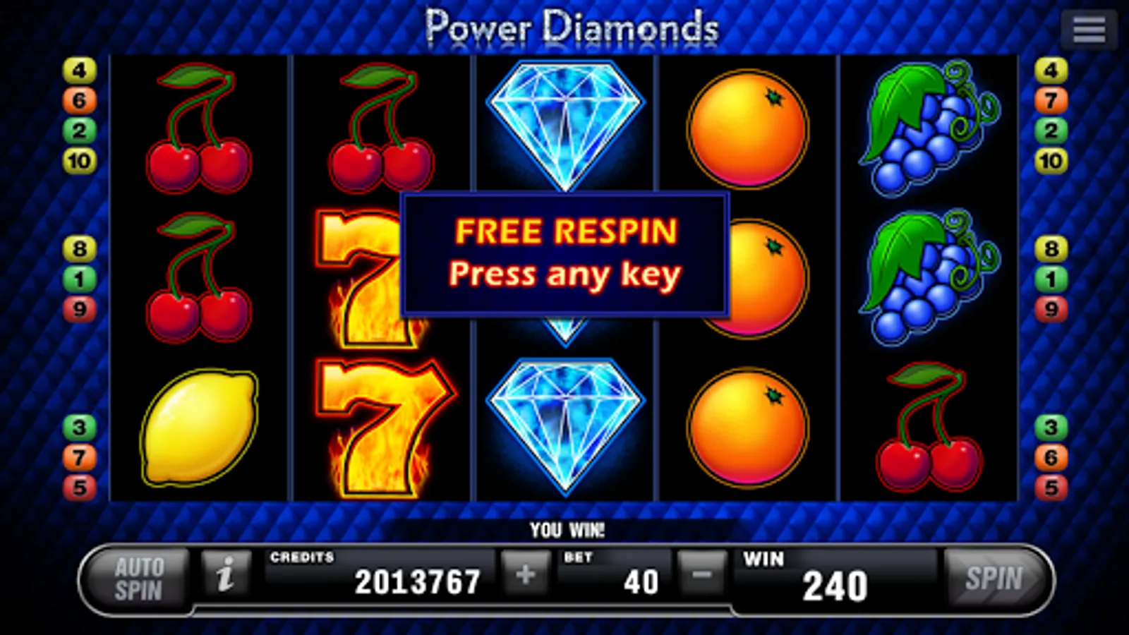 This fruit game on 10 lines and 5 reels will thrill you with expanding diamonds, hot fruits and a win line system that works two ways: Left to right and right to left – however you see it, it pays.