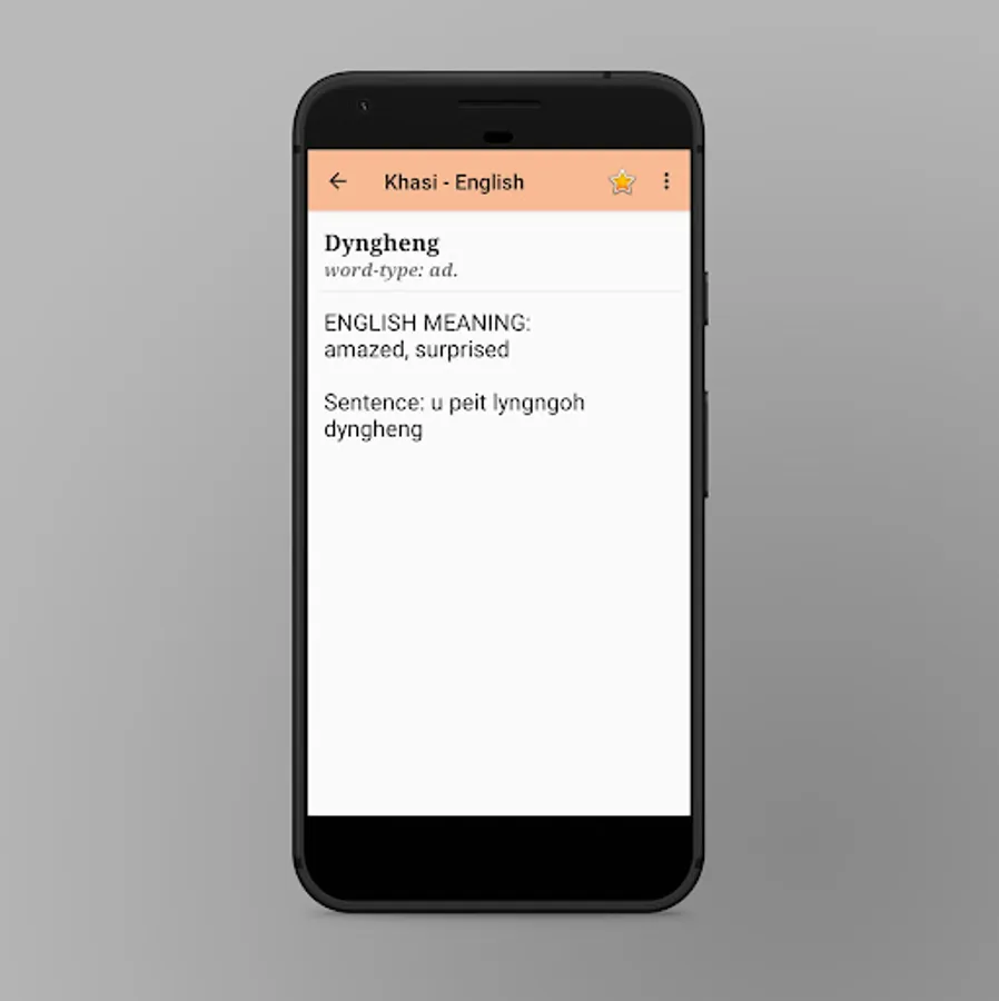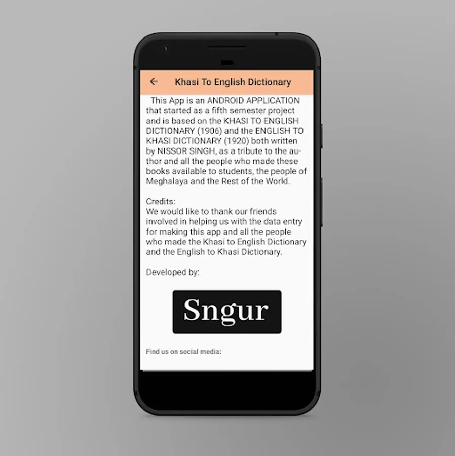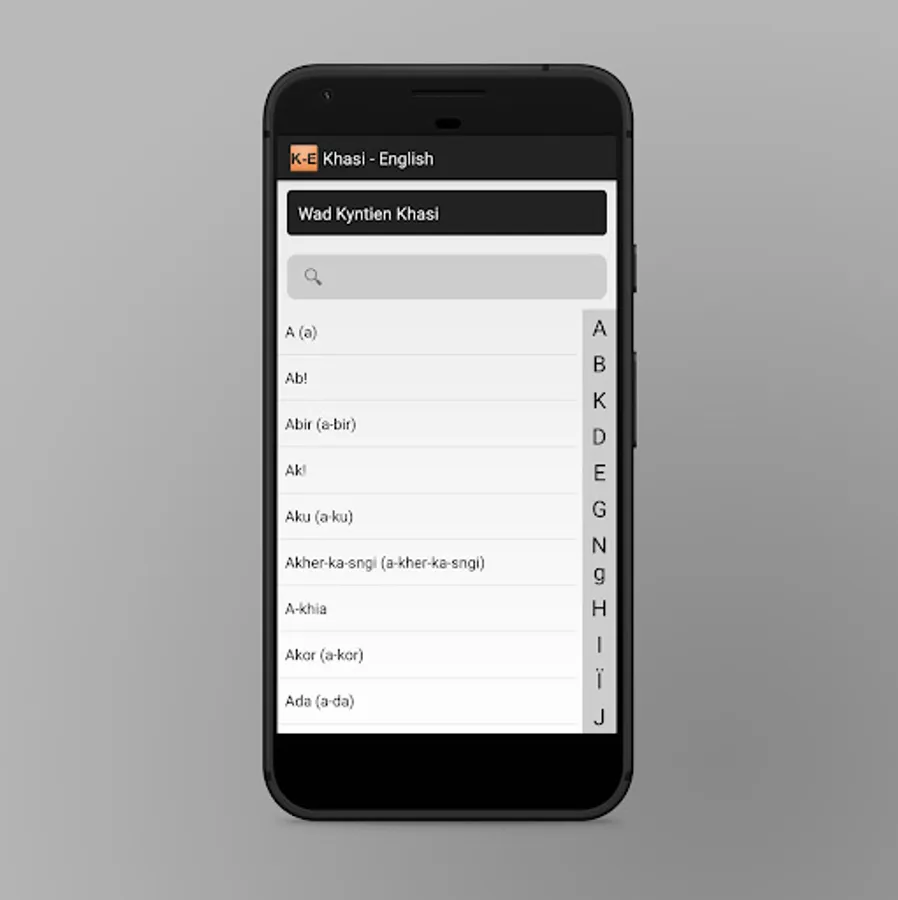 The Khasi To English Dictionary App is an Android Application that is based on the KHASI - ENGLISH DICTIONARY (1906) and the ENGLISH - KHASI DICTIONARY (1920) both written by NISSOR SINGH, as a tribute to the author and all the people who made these books available to students, the people of Meghalaya and the Rest of the World.