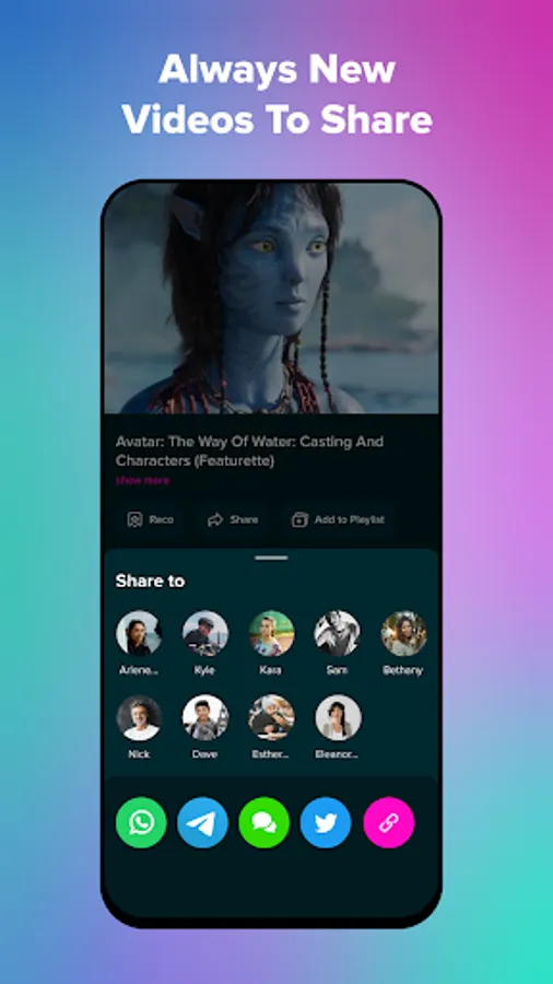 No longer do you have to copy a video link and then go to another app to share with your friends. In Snibble, it's one simple tap. Plus, you can add a message, or video message along with your share and start group chats.