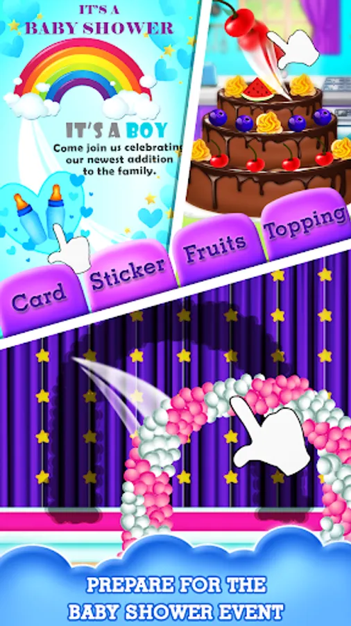 Help mommy with the routine body checkup, and keep her healthy for the upcoming baby. Decorate the invitation card for the guest and invite them to the party and also reveal the gender of the baby. Decorate the room with beautiful textures and balloons. Let's make a cake for the party with different kinds of shapes, and creams, and decorate the cake for the party.