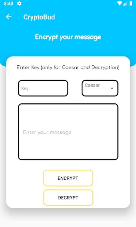 CryptoBud is an android application that encrypts messages using few encryption algorithms. It is useful for sending messages in groups that u don't want other people to know but your friend.